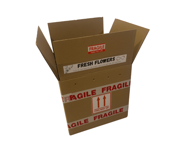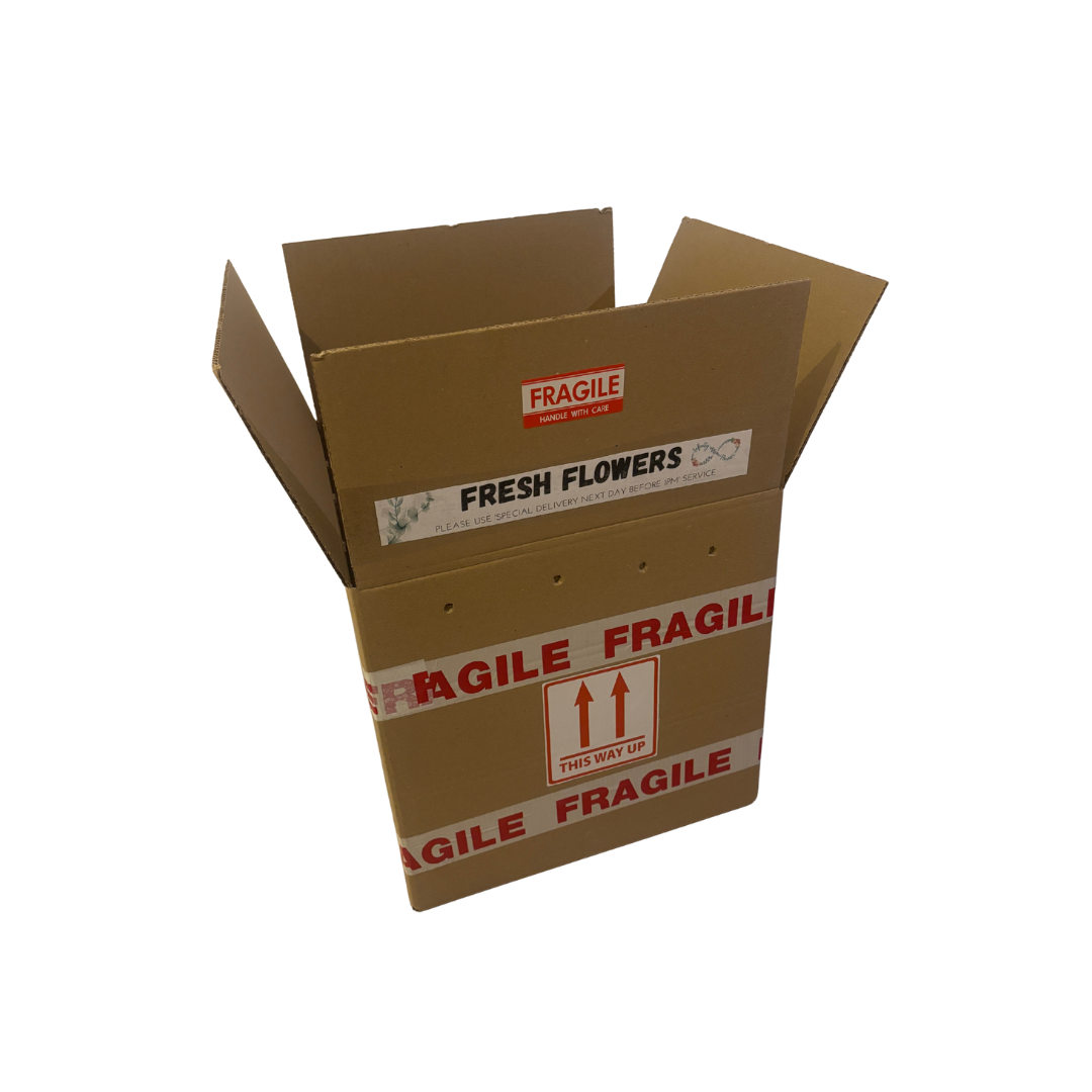 Make sure the box is no more than 60cm tall or the Post Office will charge you for a more expensive service. Write our address and 'FRAGILE FRESH FLOWERS' on the box.